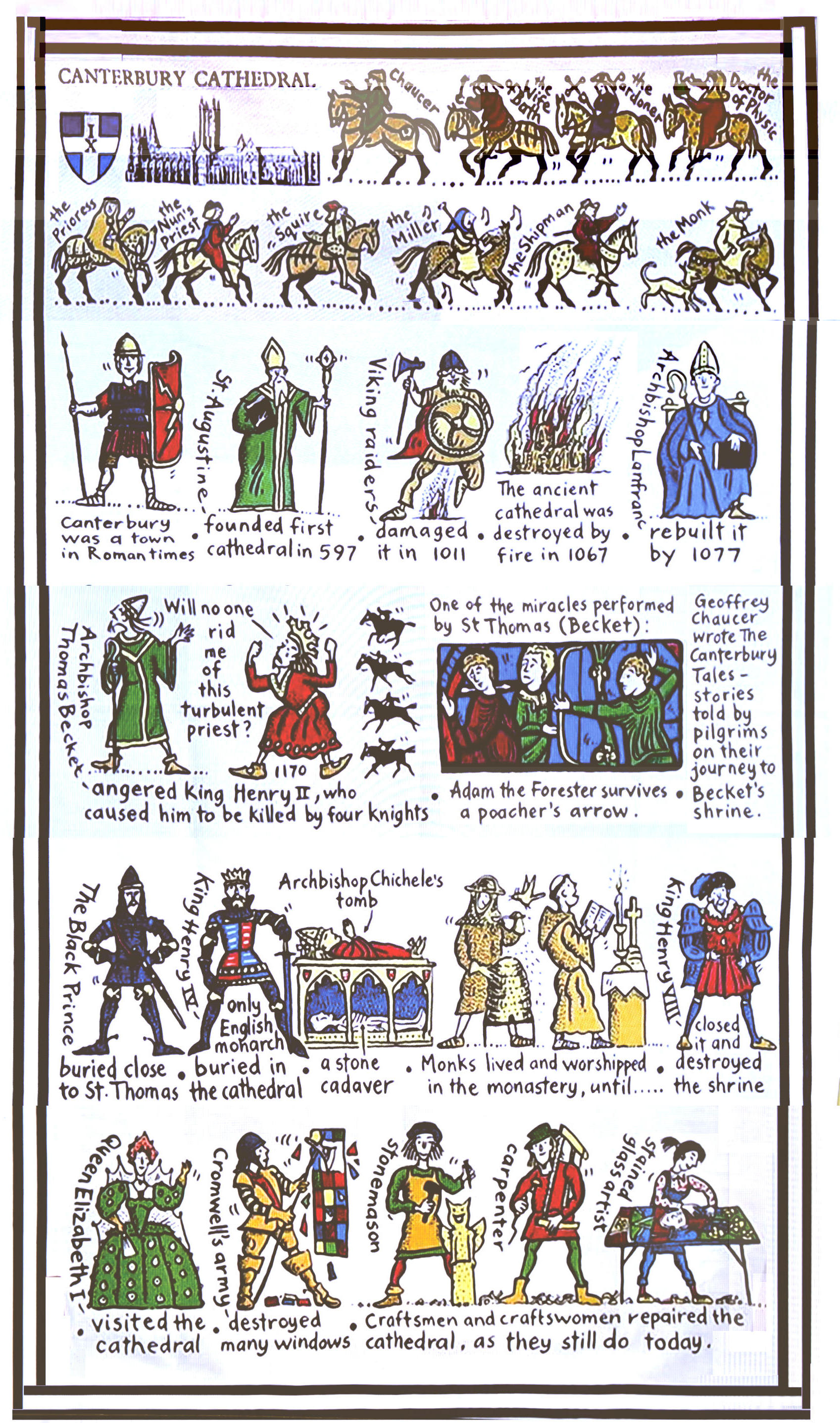 Figure 1 A Canterbury souvenir tea towel in which The General Prologue to The Canterbury Tales and the historical events of the Cathedral are illustrated, shown by Prof. Varnam-Atkin. The image has been reproduced by photographing the towel while it was displayed on the monitor, then synthesising the partial images (revised 2025).