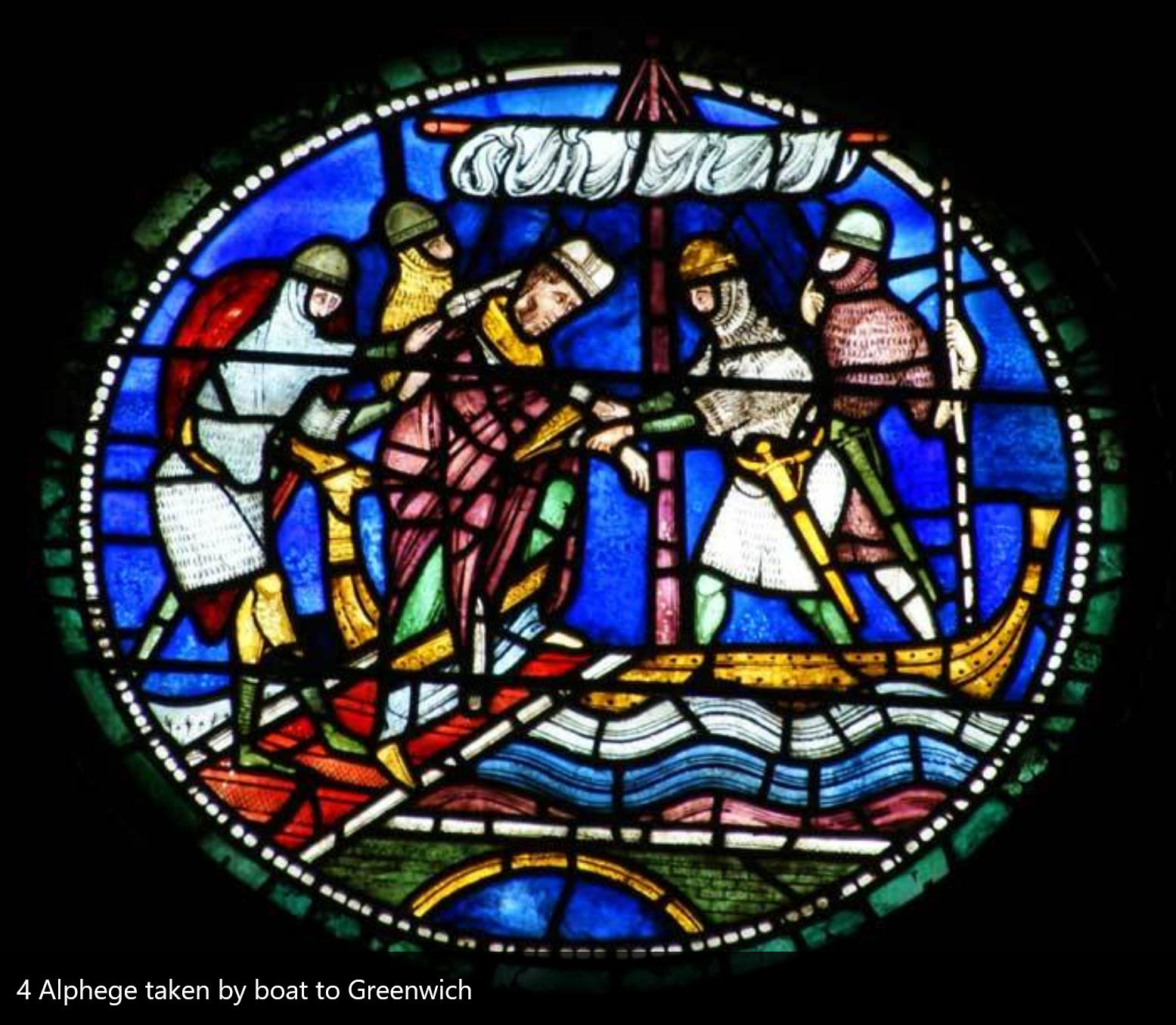 (b) St Alphege being captured by Viking and taken by boat to Greenwich in 1011 (Photographed by M. Iguchi, 19/May/2024). He was finally killed in 1012.