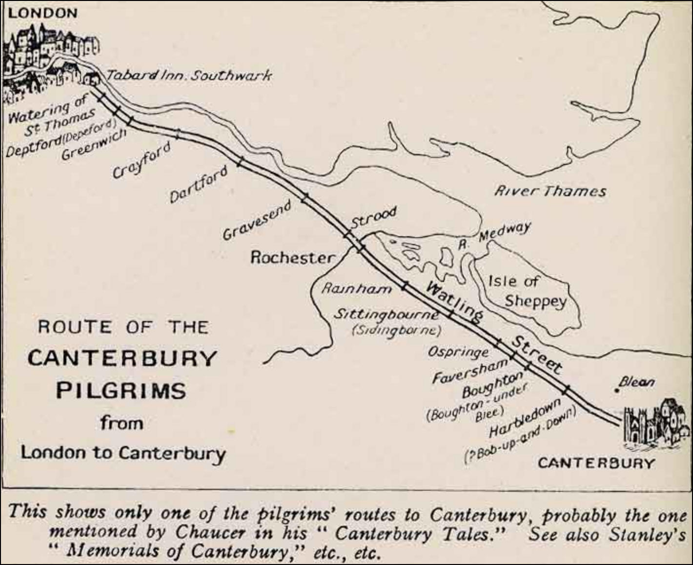 [4] Bartholomew, J.G. LLD. A Literary & Historical Atlas of Europe. London: J.M. Dent & Sons, Ltd. and New York: E.P. Dutton & Co., 1910. In: https://www.shadowedrealm.com/medieval-maps/ecclesiastical/view/route_of_the_canterbury_pilgrims