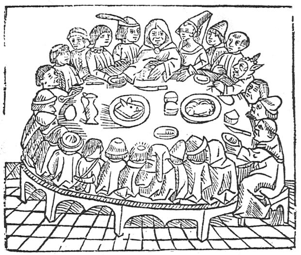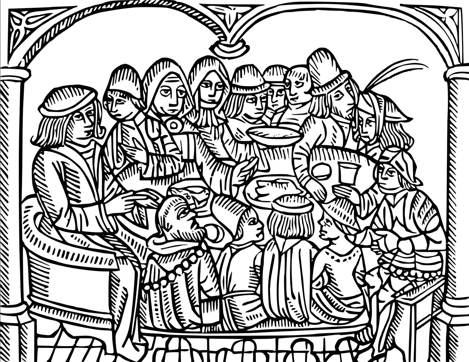 Figure 5 Illustration of the pilgrims gathered for dinner in The Tabard Inn. (1) The Caxton’ Canterbury Tales (1476)[22], (2) The Pynson’ Canterbury Tales (1476)[23].
