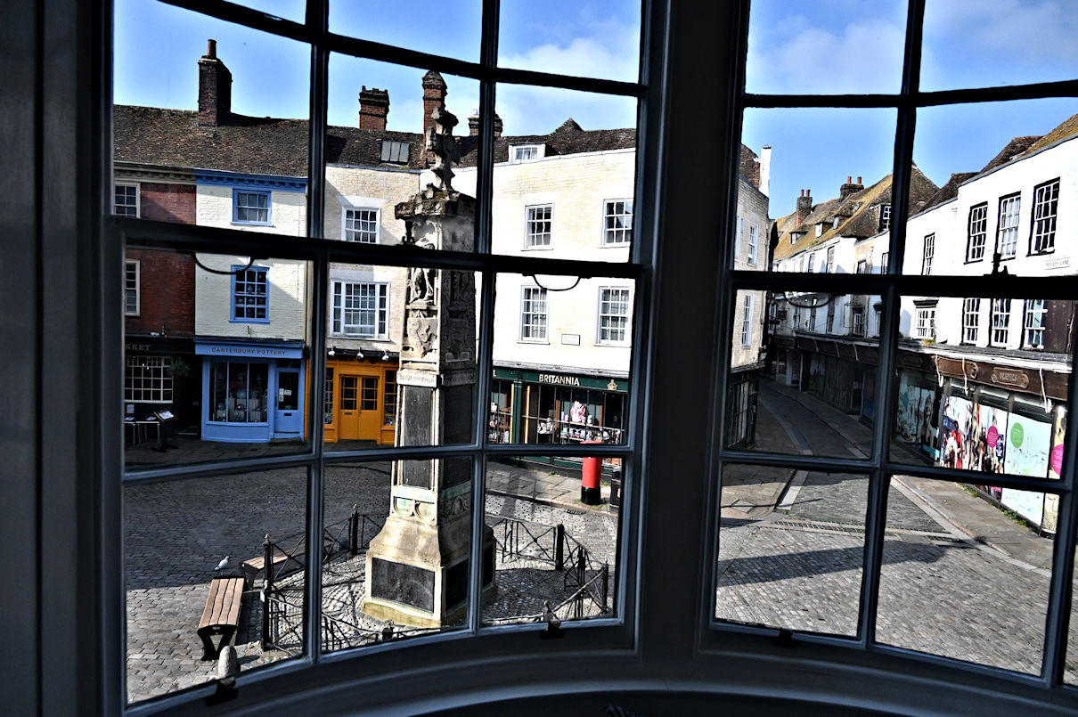 Figure 8 (a) A view of town centre from the dining room on the first floor of Cathedral Gate Hotel, (b) A lane which leads to the Canterbury Roman Museum (Photographed by M. Iguchi, 19 May. 2024).